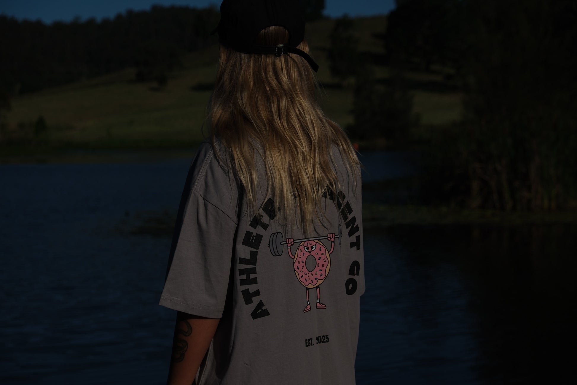 Available in dark and light gray, it’s the perfect tee for push day and donut day